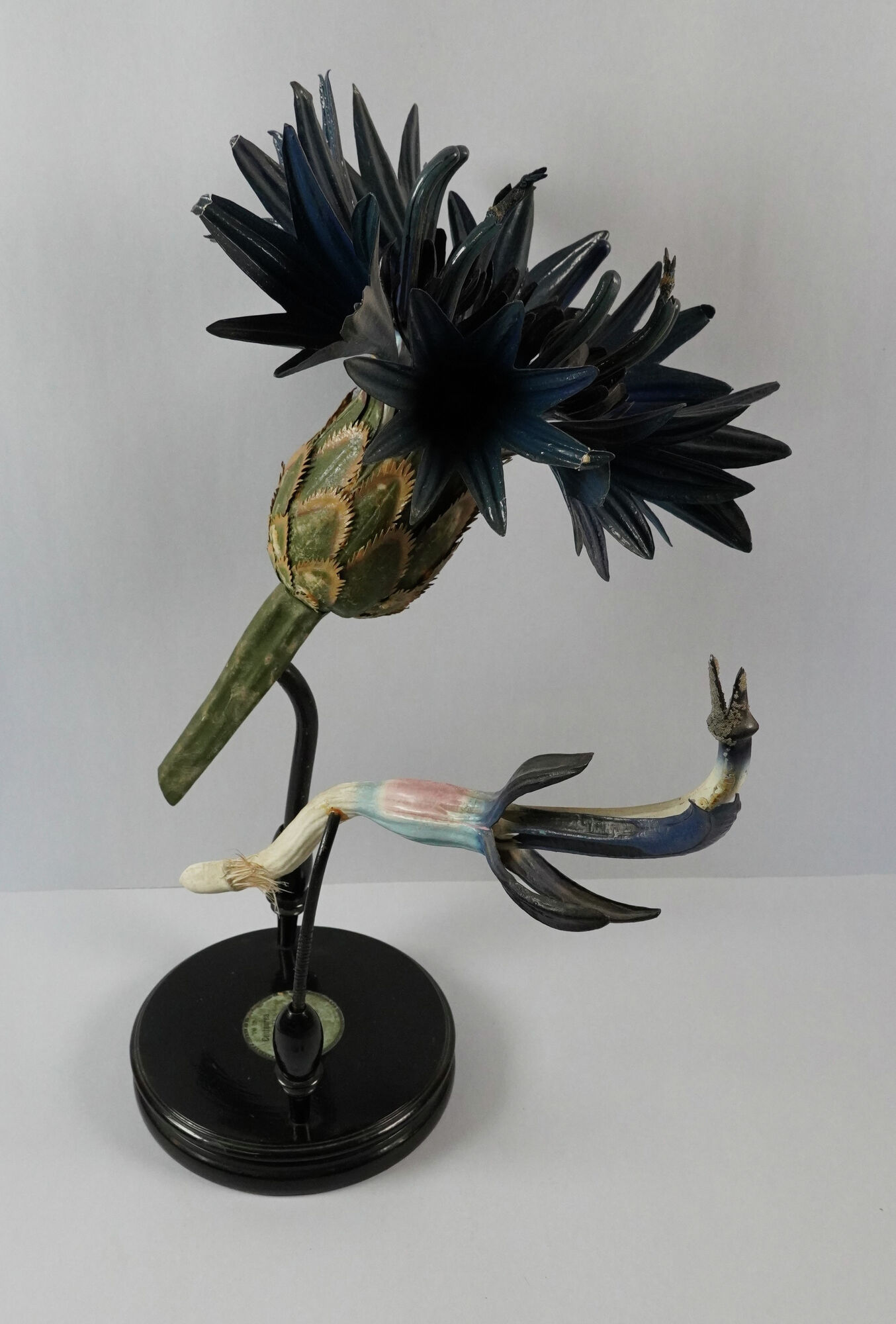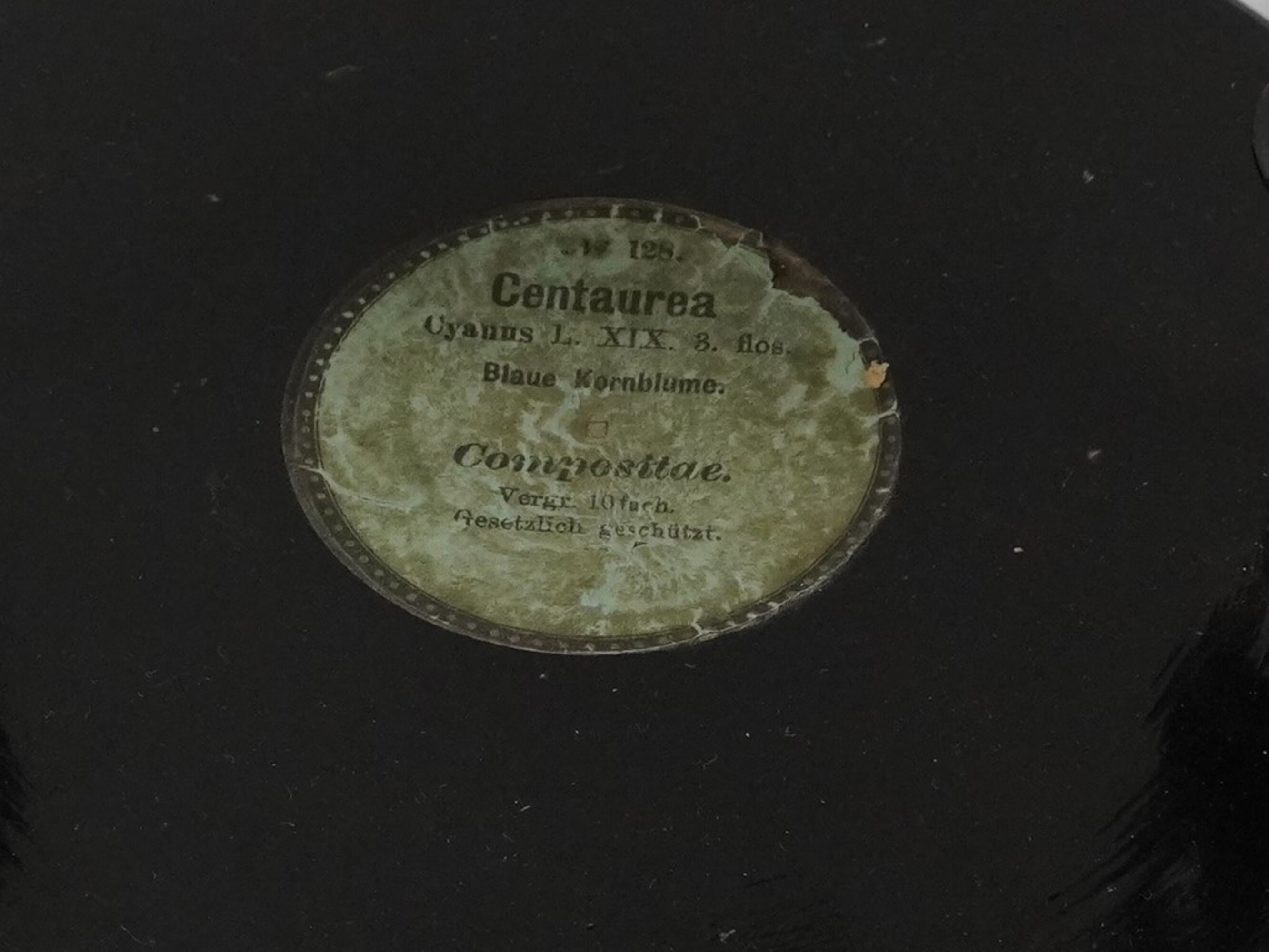 Dreidimensionales Modell einer blauen Kornblume (Centaurea cyanus, Zyane). Dargestellt sind das Blütenkörbchen und daneben eine einzelne Röhrenblüte. Das Modell ist auf einem runden Holzsockel angebracht. In der Mitte des Holzsockels befindet sich eine runde Etikette mit der Inschrift «N. 128. / Centaurea / Cyanus L. XIX. 3. flos. / Blaue Kornblume. / Compositae. / Vergr. 10fach / Gesetzlich geschützt.».