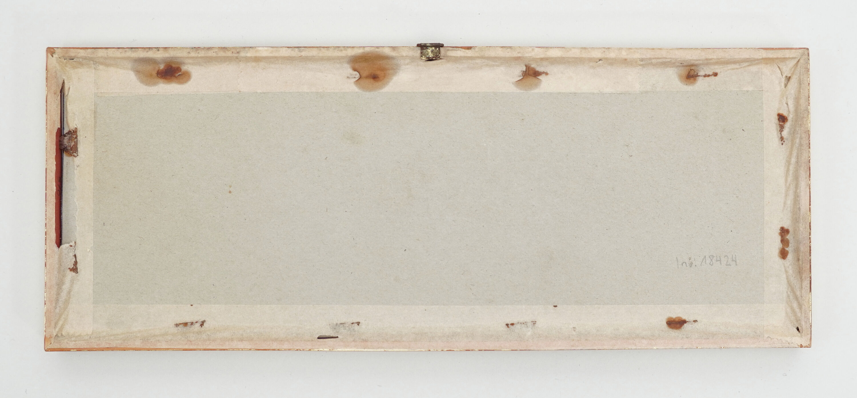 Die querformatige Ansichtskarte in monochrom blau ist auf weissem Karton aufgezogen. Darauf abgebildet ist eine fotografische Ansicht des alten Dorfs (Oberdorf) von Unterägeri mit den beiden katholischen Kirchen (mittig Pfarrkirche Heilige Familie und rechts Marienkirche, die alte Pfarrkirche) vom Fluss Obere Lorze aus. Am rechten Rand auf dem Fluss ist ein Teil eines Schiffs zu sehen. Oben links ist der Titel «Gruss / aus Aegeri.» in roter Schrift abgebildet und unten in der Mitte Herstellerangabe bzw. Angabe des Vertreibers «Jos. Ant. Hess, Unter Aegeri. H. G. & Co. Z. No. 4386» in Rot. Die Ansichtskarte befindet sich in einem profilierten Goldrahmen und ist auf der Rückseite mit Karton, Klebeband und Metallheftklammern verschlossen. Ausserdem ist oben in der Mitte eine Aufhängeöse angebracht.