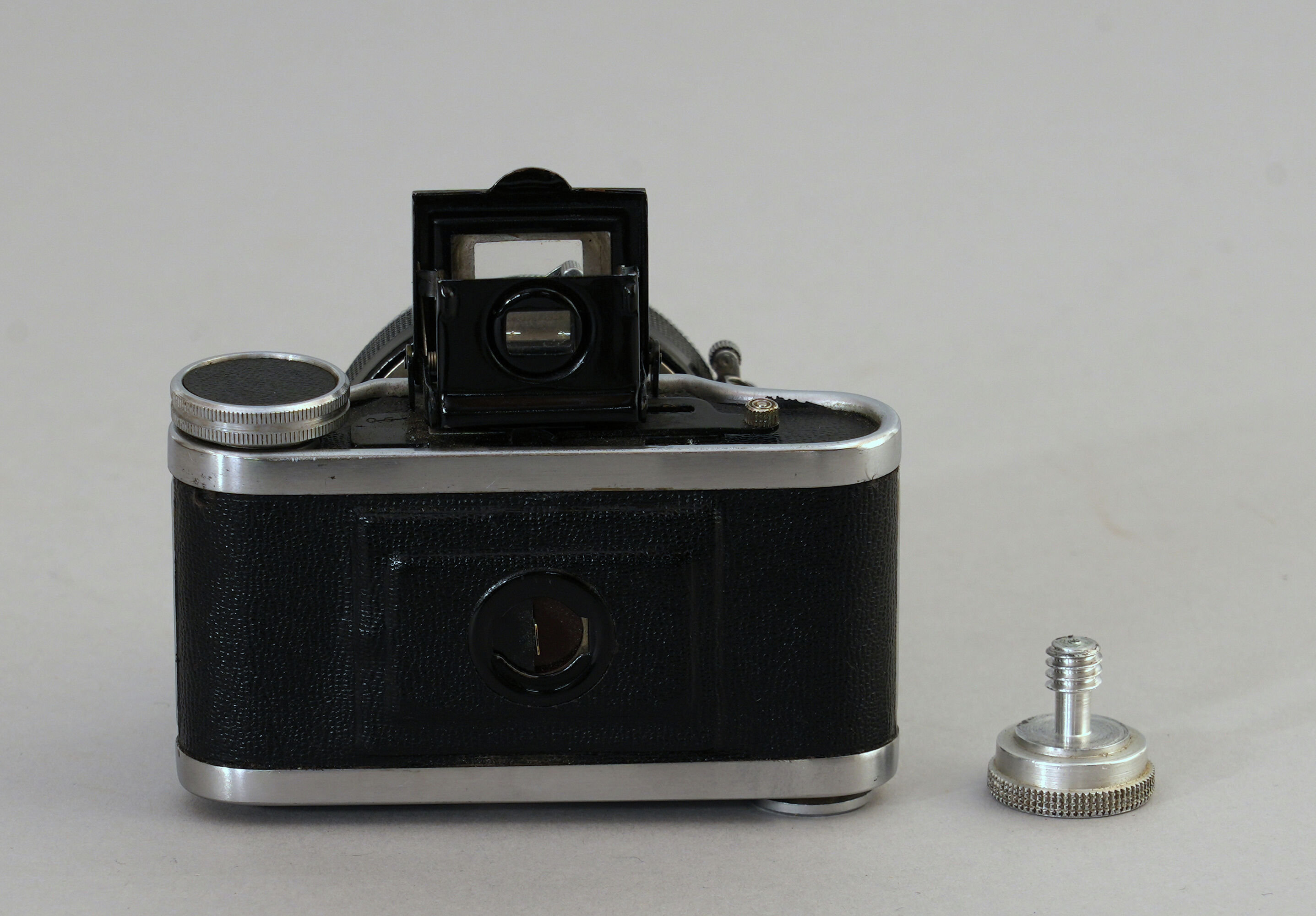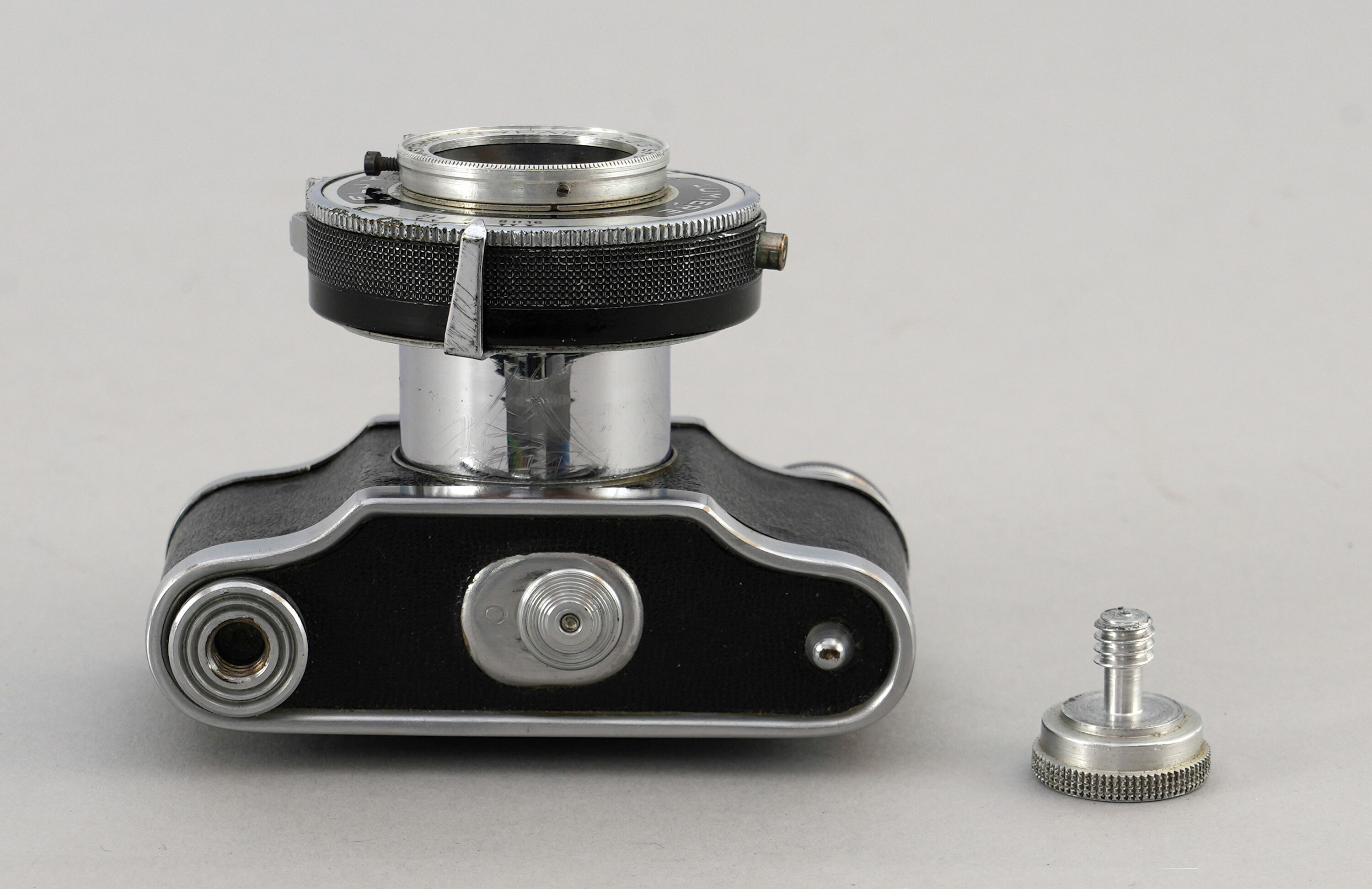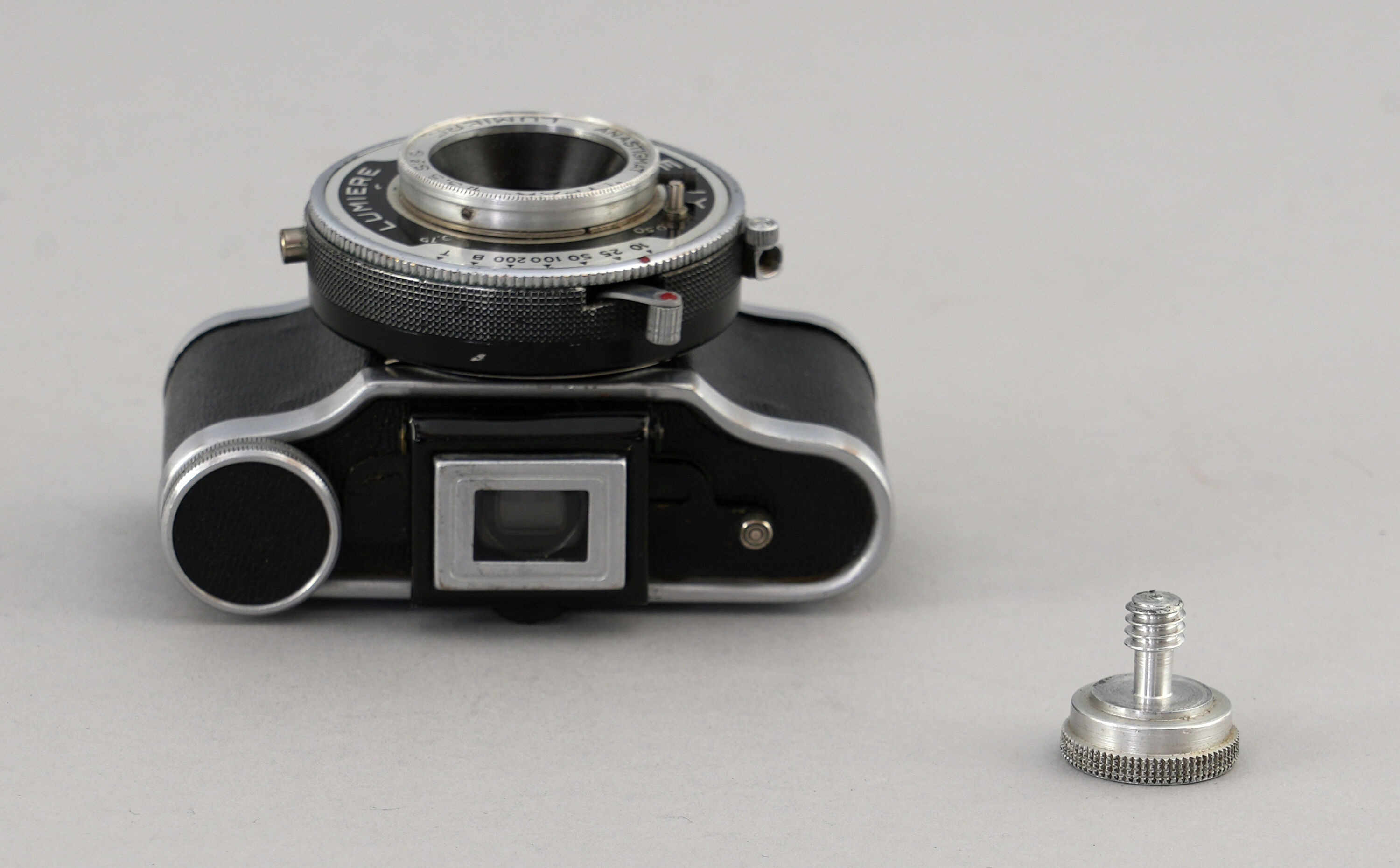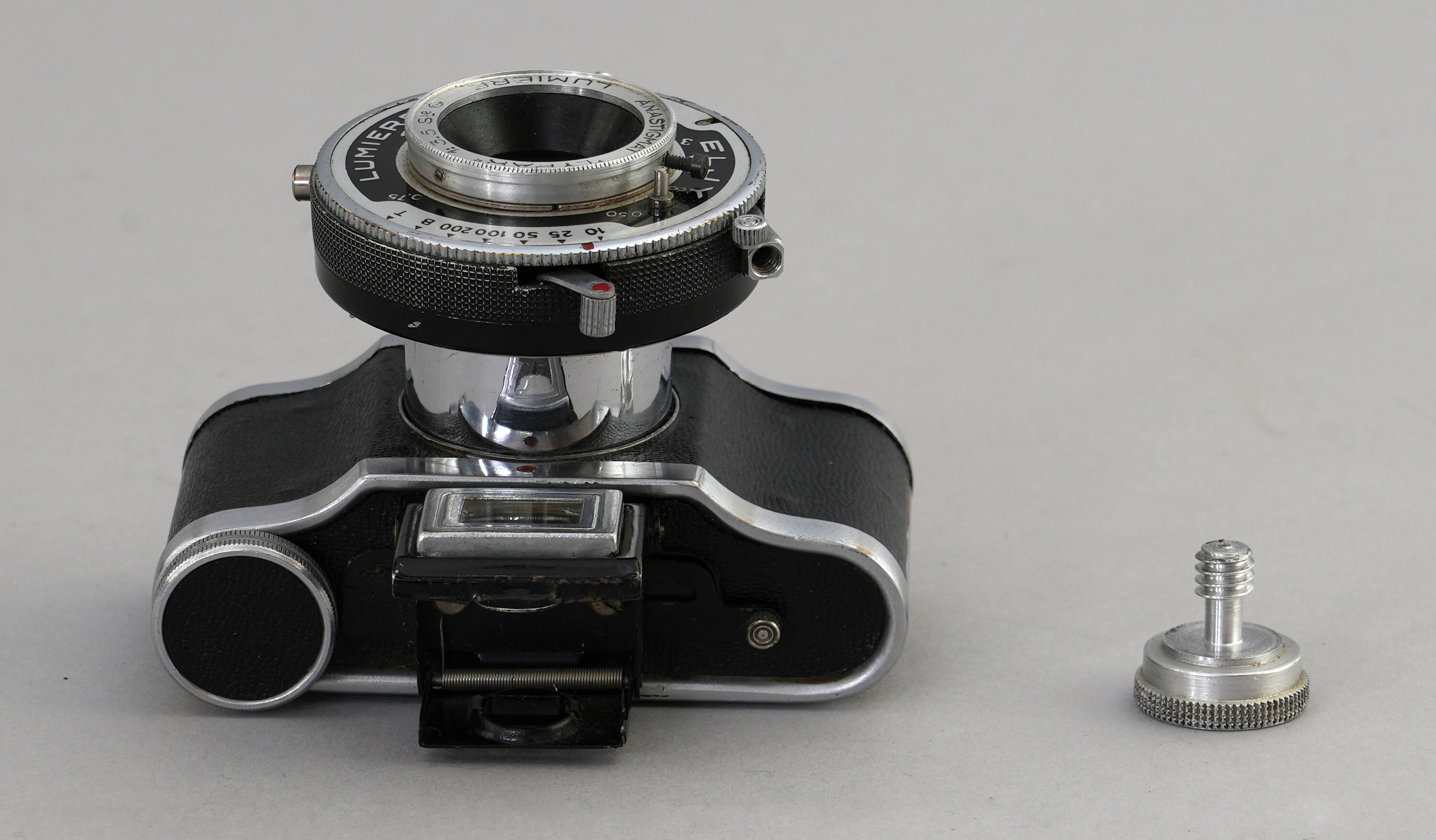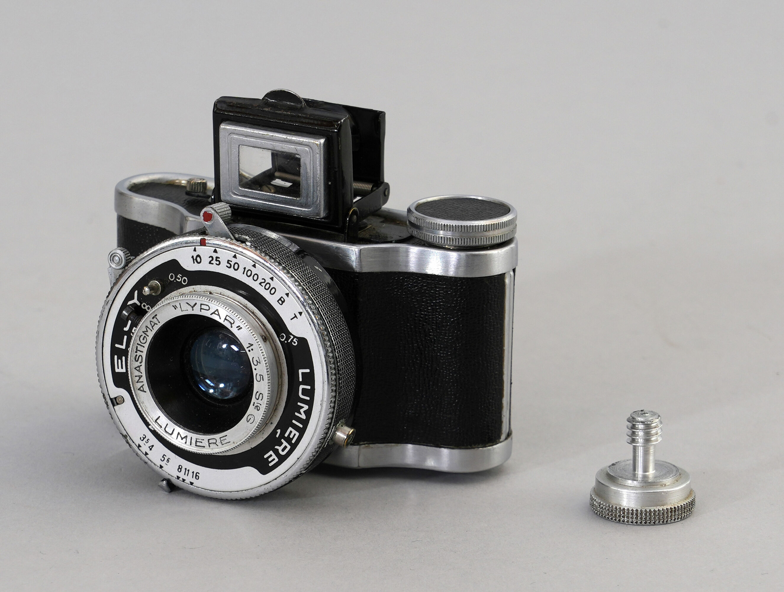 Kleine, kompakte Kleinbildkamera «Eljy» (Typ 6) der Firma Lumière in Metallgehäuse in Silber mit schwarzem Kunstlederbezug. Objektiv mit einer 50-mm-Brennweite auf ausziehbarem Tubus montiert. Auf des Frontseite des Objektivs ist die Inschrift «Anastigmat Lylpar 1:3.5 Lumière» eingraviert. Zentralverschluss mit Zeiten von 1/10 s–1/200 s. Minimale Fokussierentfernung 0,5 m. Aufklappbarer optischer Sucher auf der Oberseite. Filmtransport über kleines Rändelrad aus Metall auf der rechten Oberseite. Rückwand aufklappbar zum Einlegen und Entnehmen des 35-mm-Films. Unten ein Gewinde zur Befestigung im passenden Etui oder zur Montage auf einem Stativ.