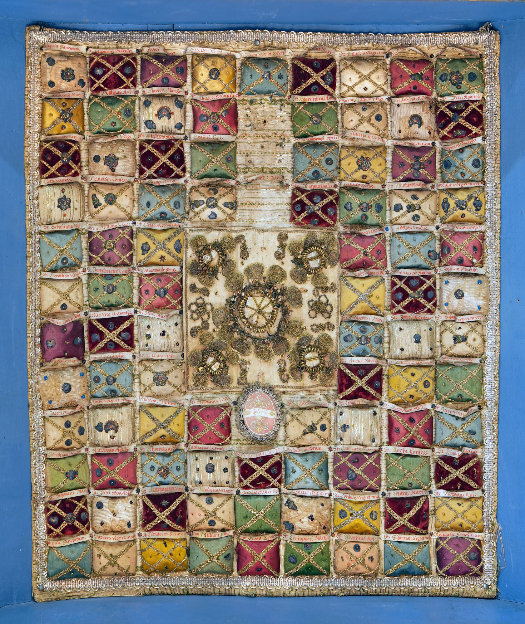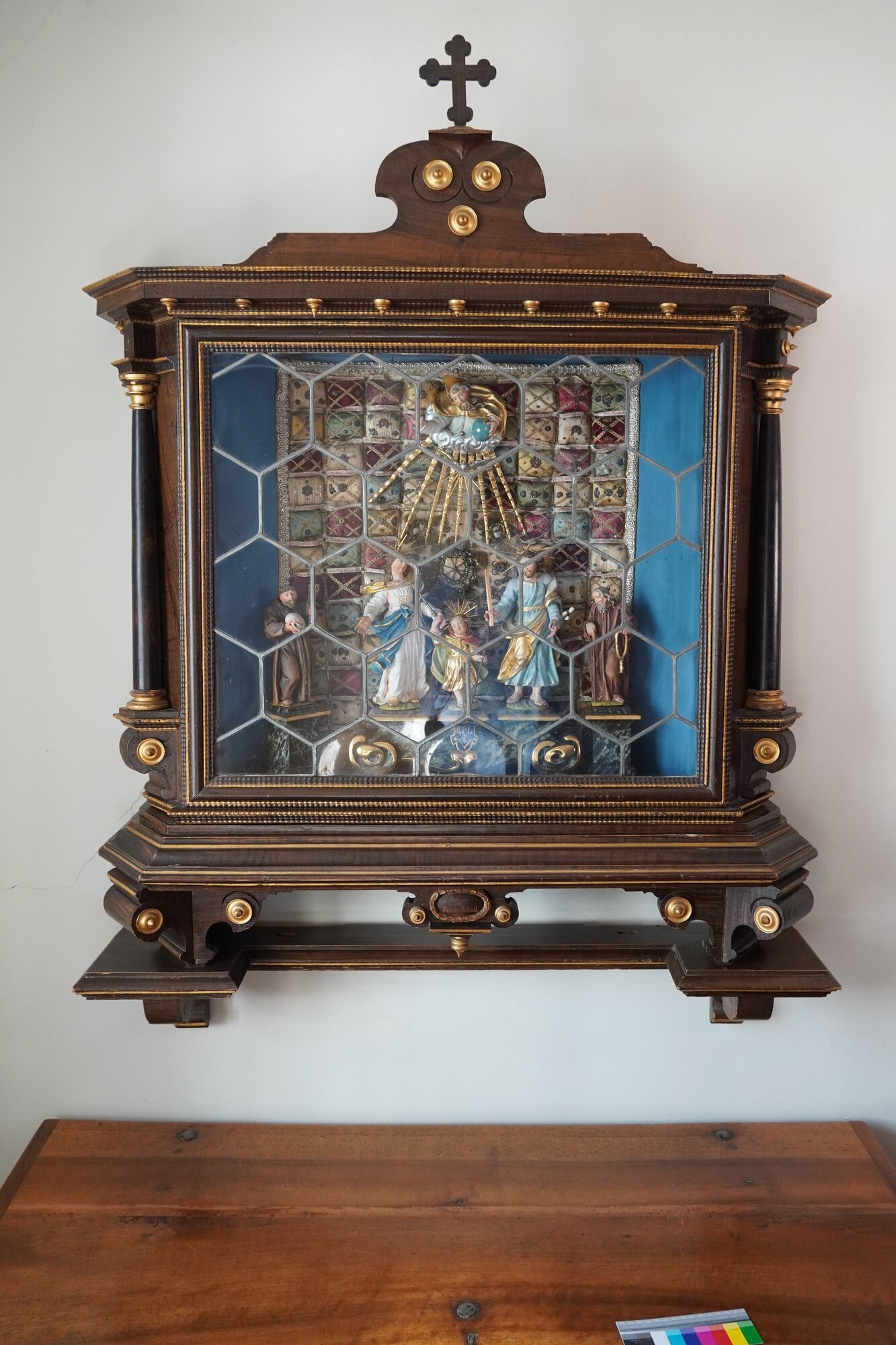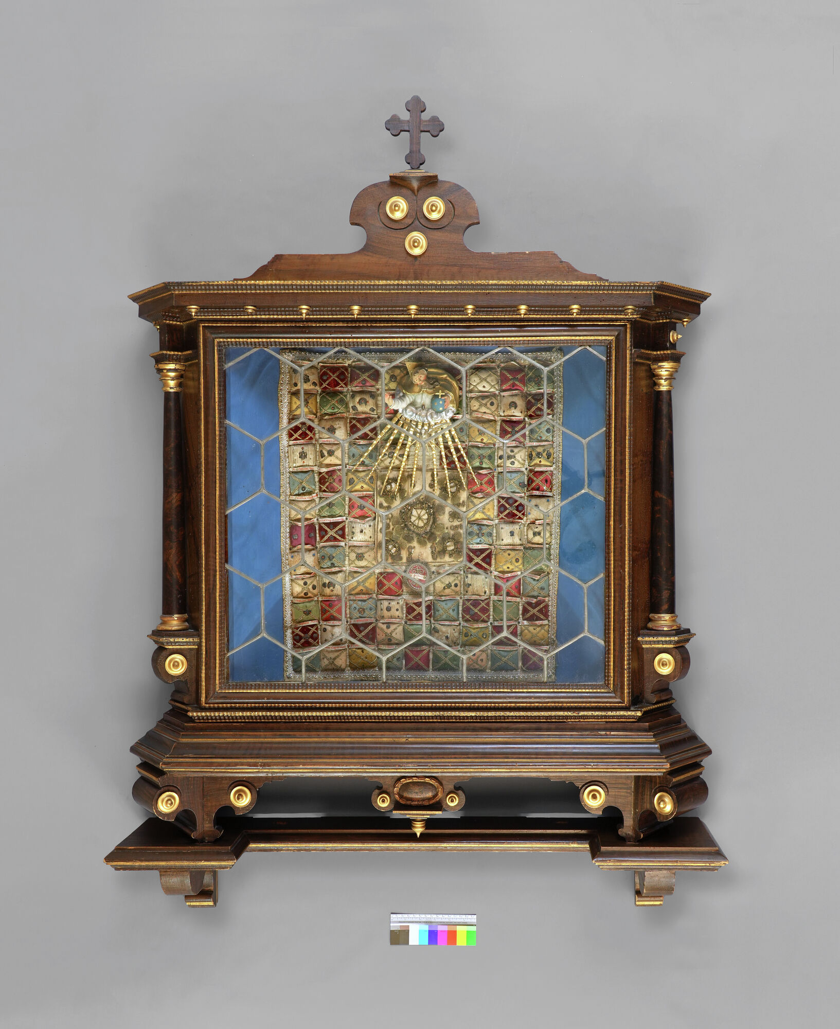 Der Korpus von zwei auf Voluten ruhenden Säulen flankiert, vorne mit Schiebetür aus sechseckigen, in Blei gefassten Butzenscheiben versehen, darin - an der Wand des Schreins - auf cremeweissem Textilgrund 92 farbige, rechteckige, ausgepolsterte Kisschen in neun senkrechten Reihen, die Reliquien enthalten (3 Kissen fehlen). Sie sind aufwendig mit goldfarbenen Spitzenborten und kleinen, farbig gefassten metallenen Applikationen mit diversen Motiven (Engelsköpfe, Rosetten, Herzen, Eicheln, etc.) verziert. Jeder Reliquie ist ein Papierstreifen zugeordnet, auf dem der Name des oder der Heiligen mit roter Tinte handschriftlich vermerkt ist (die sogenannte Cedula). Die Cedulae sind über den Kissen angebracht. In der Mitte befindet sich ein quadratisches Tuch mit fünf (Knochen?)Stücken in Fassung von grossen Rosetten aus Drahtarbeiten und Glasperlen(?) sowie ein ovales Medaillon mit Inschrift "S. Reliquien". Darüber eine Skulptur von Gottvater und Heiligem Geist (Inv. 21245.3), die mit einem Nagel an der Wand des Reliquienschreins befestigt ist. Ursprünglich befanden sich im Schrein mehrere Figuren.