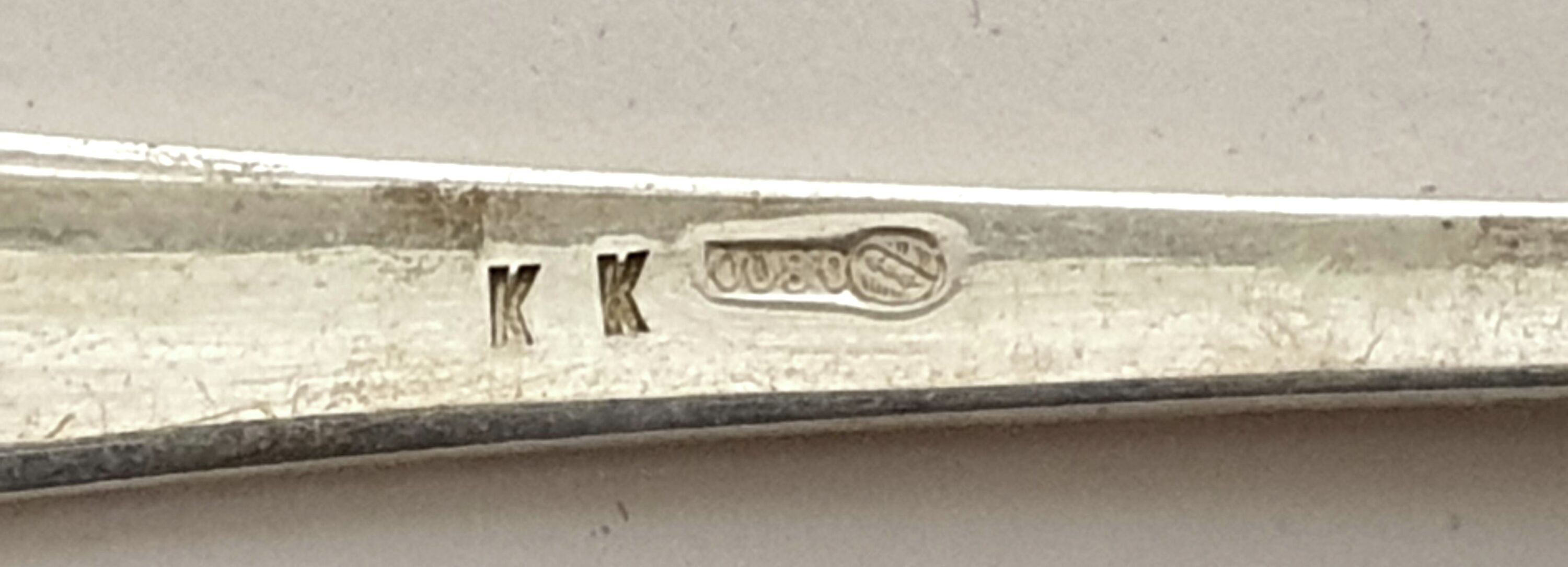 Sechs silberne Suppenlöffel in einem Etui. Die Löffel haben eine spitze Laffe, einen flachen Stiel und sind am Ende erweitert und gerundet. Auf der Rückseite des Stiels sind die Löffel mit «PK» graviert. Ein Löffel ist zusätzlich zu «PK» mit «EM» graviert. Drei Löffel sind mit der Goldschmiedemarke «K K» und wiederum drei Löffel sind mit der Goldschmiedemarke «C SCHELL» versehen. Alle sechs Löffel weisen rechts neben der Goldschmiedemarke ein Wappen sowie die Feingehaltsangabe «0.800» auf. Das Etui ist mit rotem Satinstoff ausgepolstert und mit einem Ösenverschluss versehen.