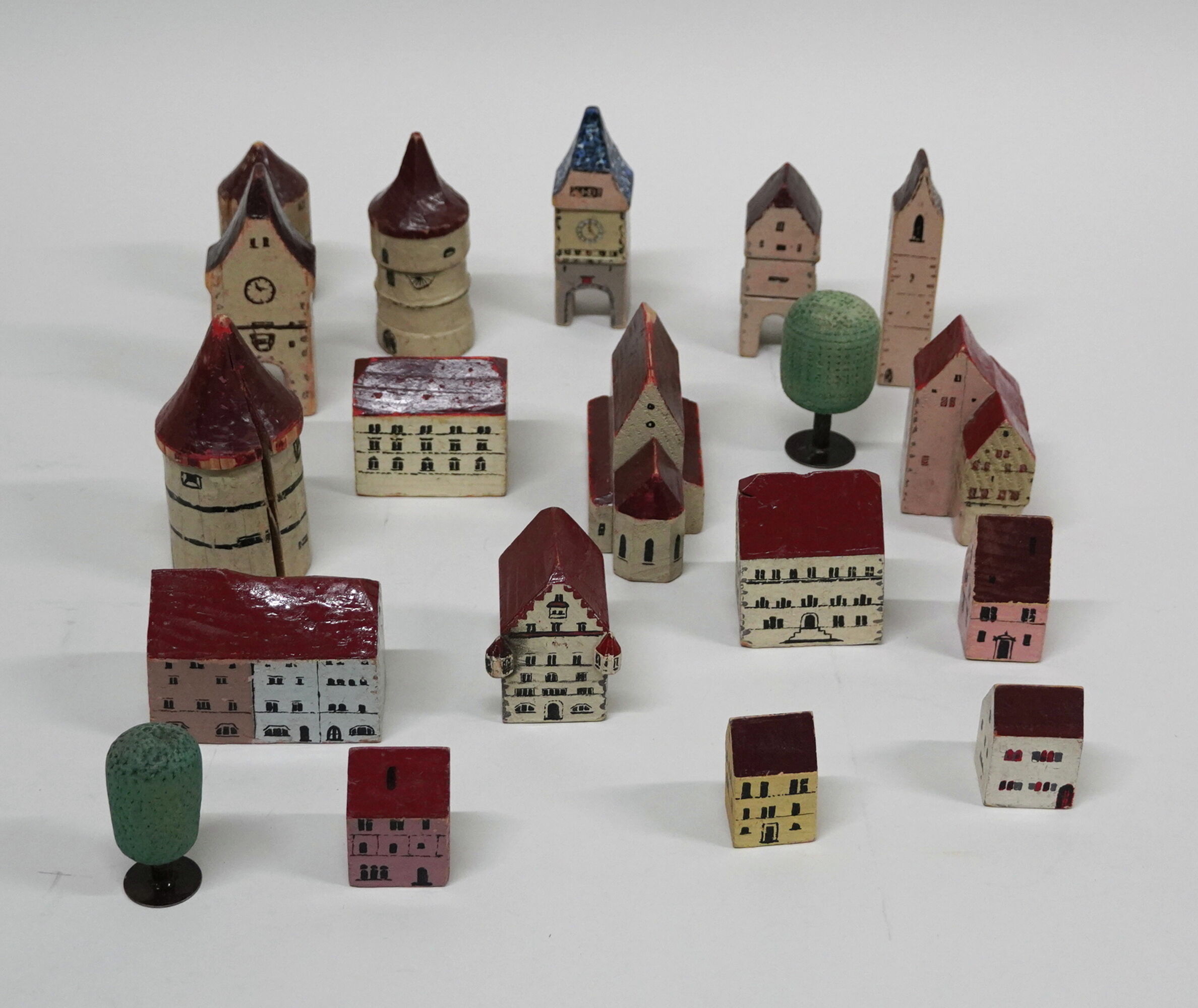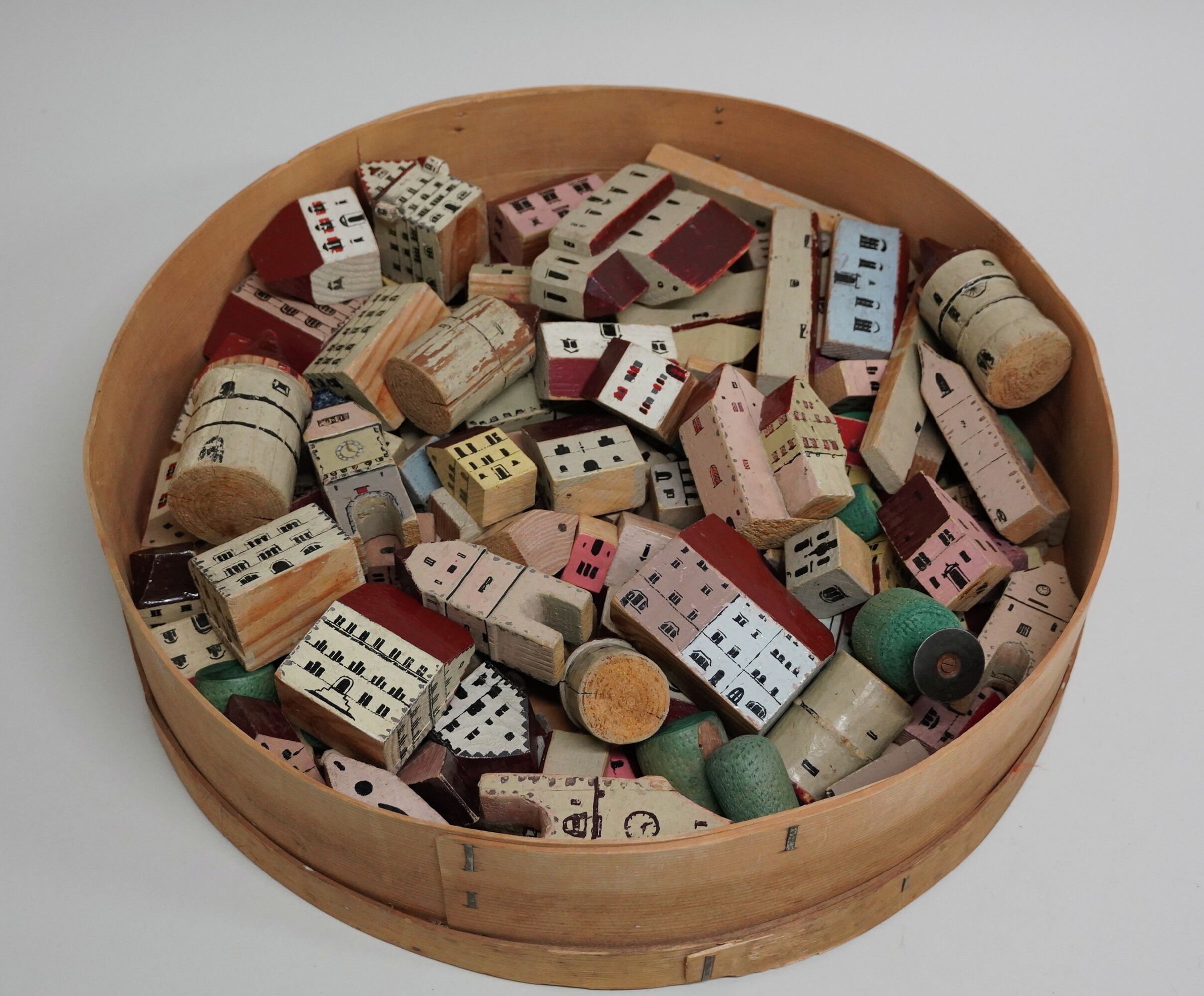 Toy town consisting of painted wooden buildings representing the town of Zug in miniature. The multipart set is in a round chipwood box with the name “Mrs. Dr. Arnold-Müller Zug” written on it.