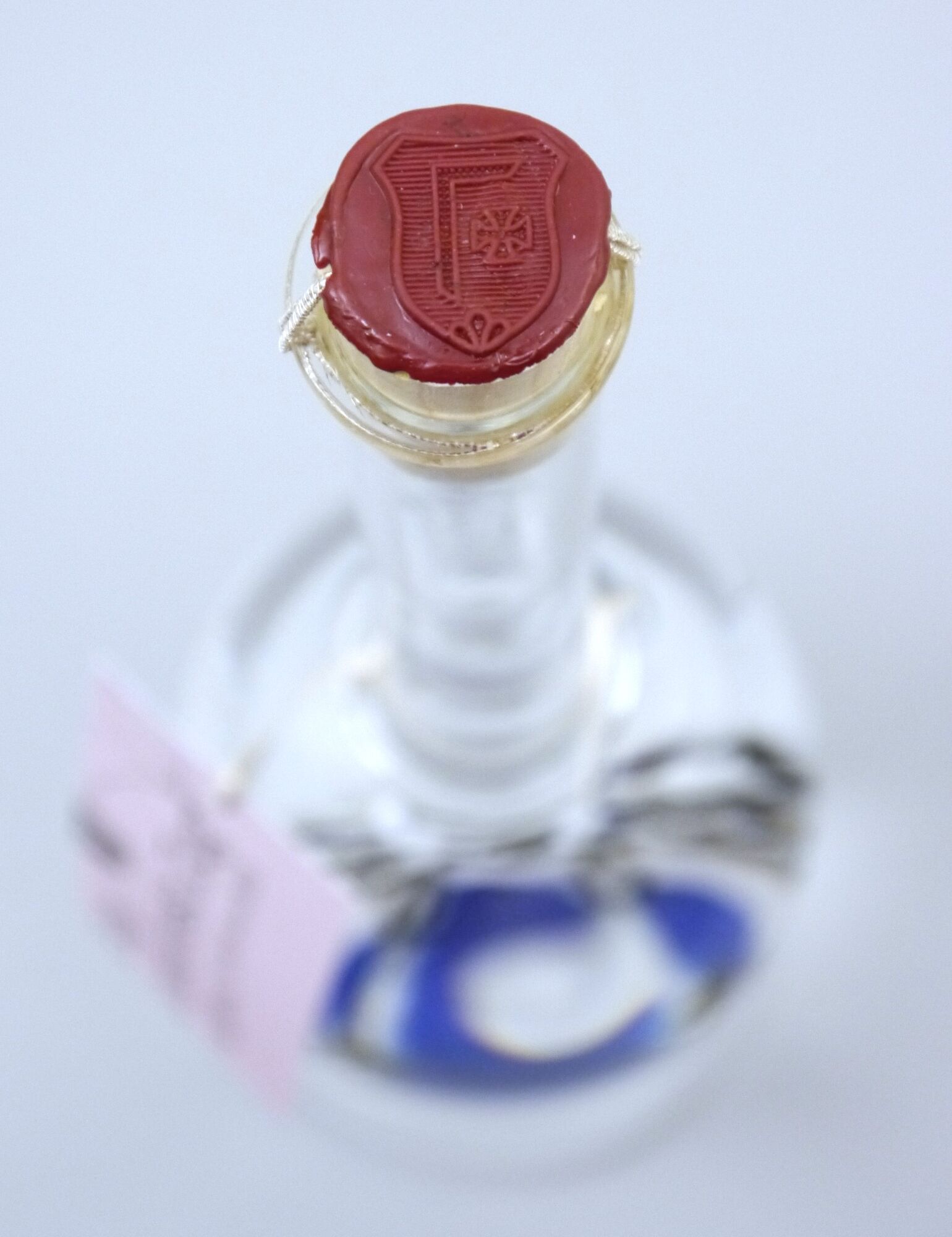Materials/techniques: Glas, mundgeblasen, gefärbt; Kork; Siegellack, geprägt; Kirsch; Kartonpapier, bedruckt; Kunstfaserkordel