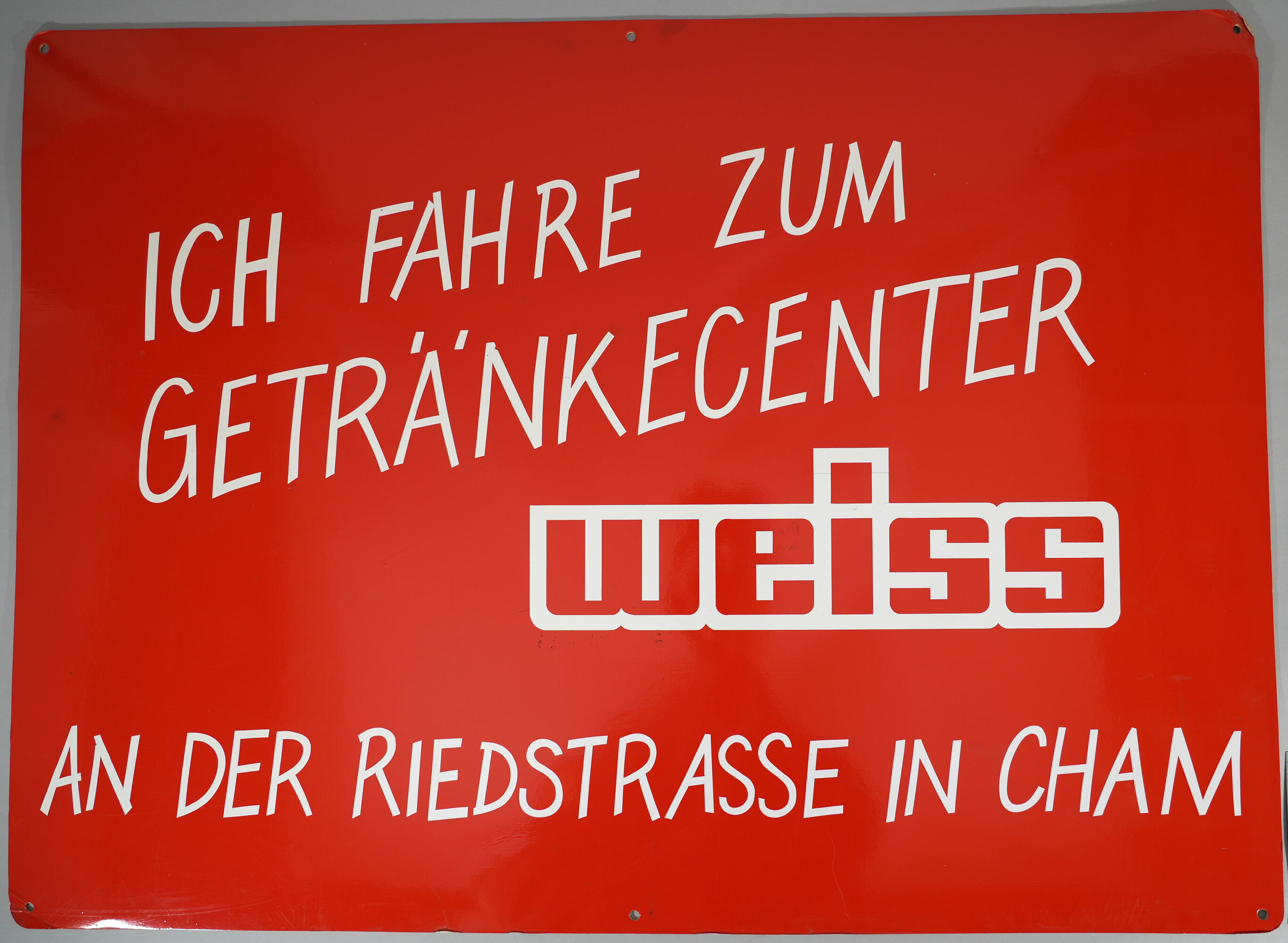 Auf dem querrechteckigen roten Kartonschild mit abgerundeten Ecken befindet sich auf der Vorderseite der Werbespruch und das Firmen-Logo «ICH FAHRE ZUM / GETRÄNKECENTER / [Firmenlogo «weiss«] / AN DER RIEDSTRASSE IN CHAM». Die Rückseite ist weiss gehalten. In allen vier Ecken befindet sich je ein Loch zur Aufhängung.